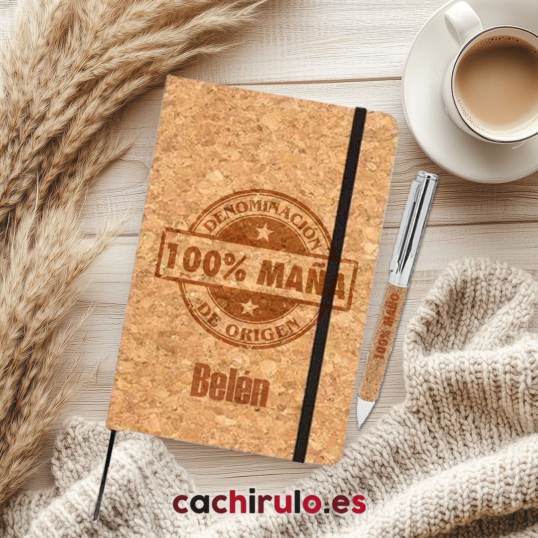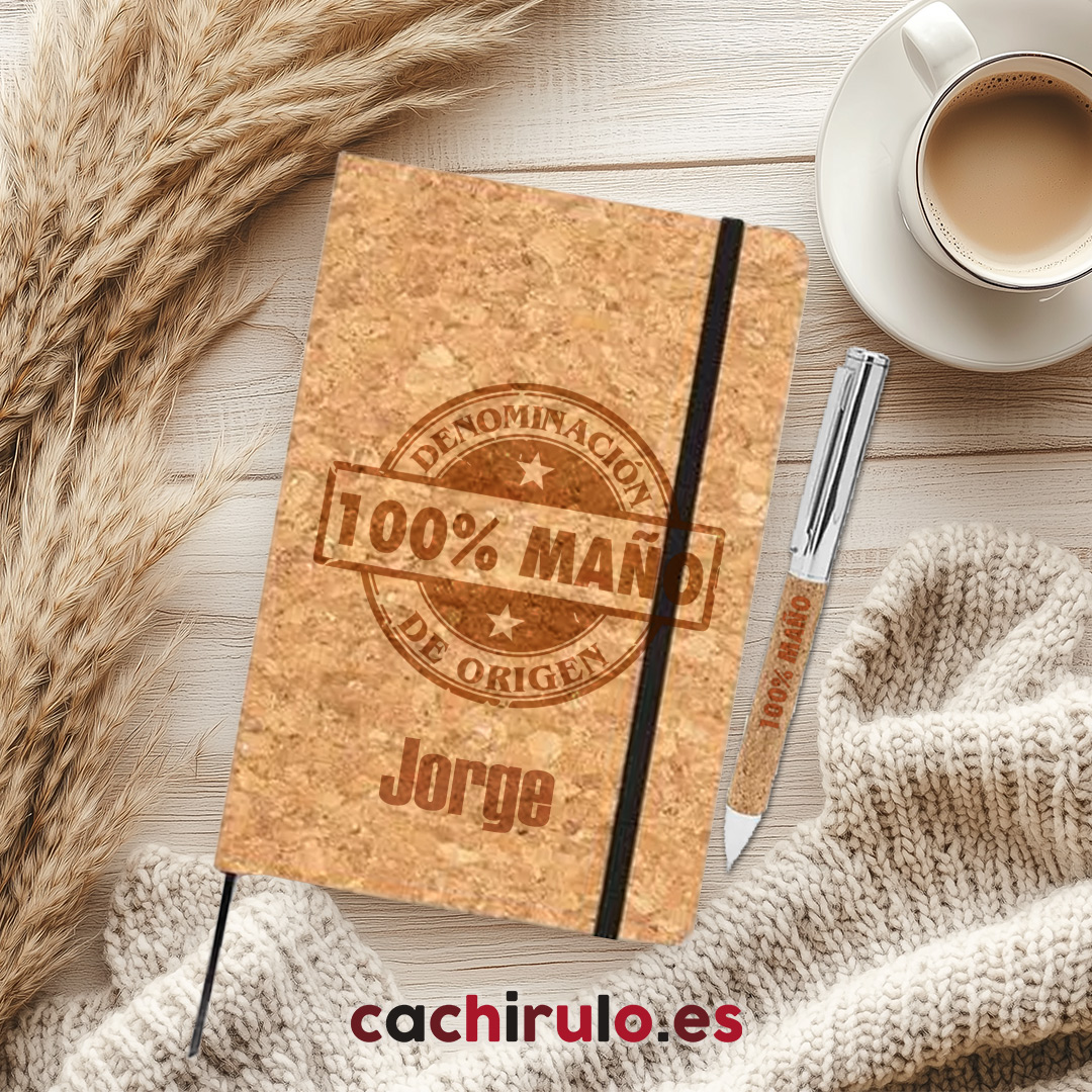 Bloc de notas de corcho personalizado “100% Maño/Maña” + bolígrafo a juego | Grabado láser premium